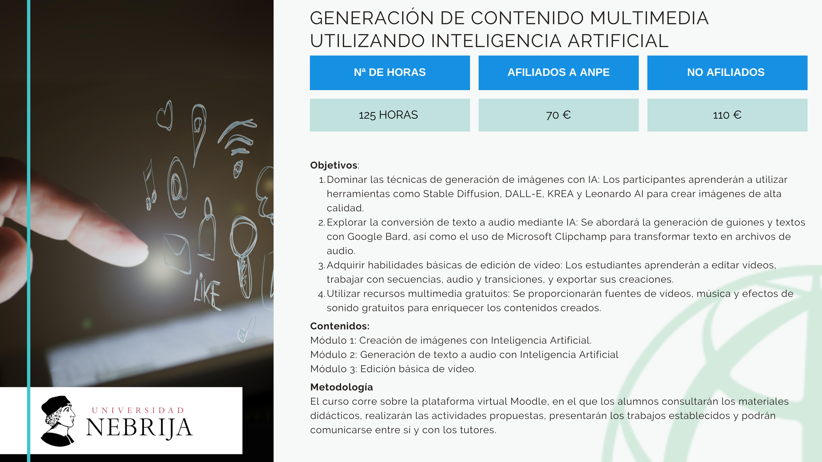 Para solicitar más información o consultar cualquier duda, podéis llamar al 915213111 / 915214348 o a través del correo electrónico formacion@anpe-madrid.com.